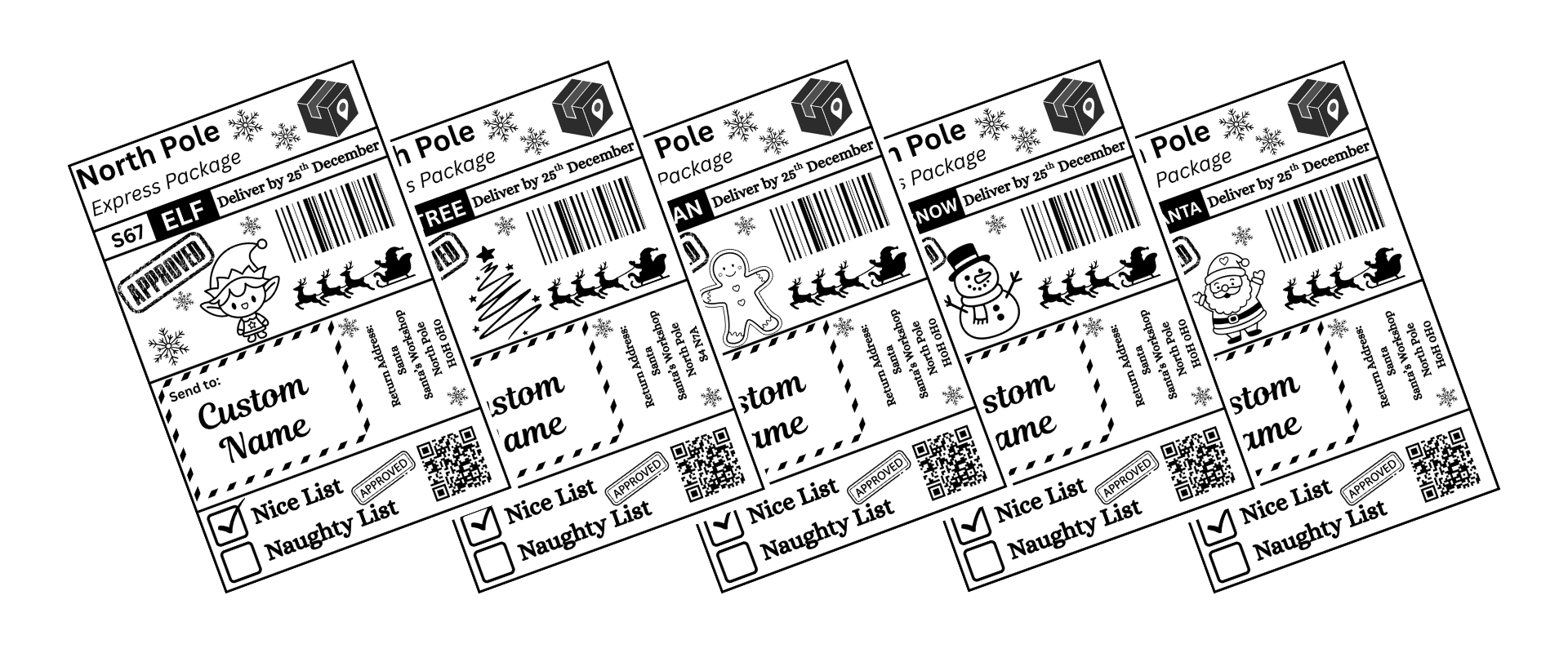 Add a personal touch to your packages this season with our custom holiday shipping labels, printed right here at Package Point. Choose from five designs Elf, Tree, Gingerbread, Snowman, and Santa and customize each one with a name and a Nice or Naughty tag. Printed in black and white on 4×6 adhesive thermal labels, they’re perfect for any parcel, present, or to cover an old shipping label.